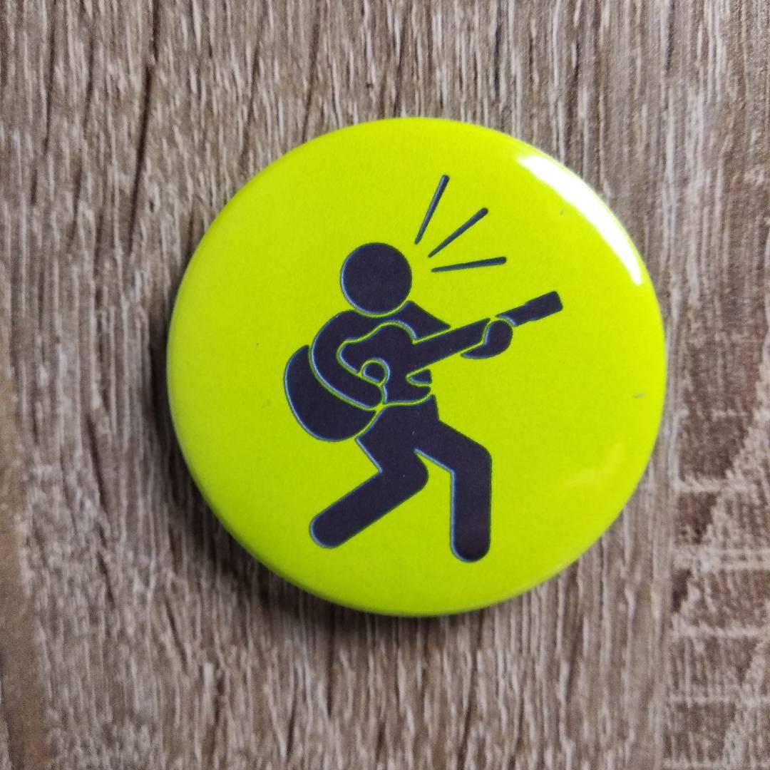 Металевий значок зі шпилькою діаметром 50 мм або 58 мм на якому зображено фігуру гитариста.